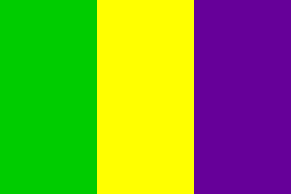 According to Municipal decision 25 August 1988 and Ministerial decision 13 December 1988, the flag is made of "Three equally wide vertical stripes Green, Yellow, and Purple (purper)." The last color is in the book [pbd98] is nearly black.