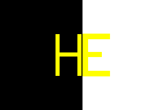 The flag is vertically divided black-white, with the letters HE in yellow in the middle.