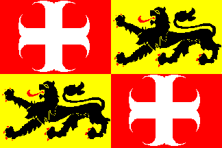 The flag is: Quartered, I and III Gules, a cross anchored Argent, II and IV Or, a lion passant Sable, armed and tongued Gules. Proportions are 2:3.