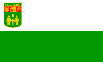 The flag of Radnevo was adopted in 1999. I have not seen the flag but according to the description of its author Ivan Dimitrov in the local issue (35 years the Town of Radnevo, 3-7 September 1999), the flag is formed by two equal stripes: white and green with CoA on the white one, i.e. it is not clear whether the CoA is in the center of the stripe or to the hoist.