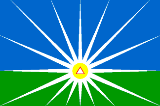 The flag of Uberlândia measures 1.2 by 1.8 meters. The hoist is divided with the upper two-thirds blue (representing the sky) and the lower one-third green (representing the fields and lands of the municipality). The center of the dividing line between blue and green is referred to as the "ideal center" of the flag. A white circle of 12 centimeters diameter is centered at that point; upon it is centered a smaller yellow circle of 9 centimeters diameter circumscribing a red-bordered white isoceles triangle. The triangle is the main symbol of the State of Minas Gerais. White pointed rays equally spaced at 30º angles issue from the white circle and extend to the edges of the flag all around, forming a 12-pointed star representing the highway system radiating from Uberlândia. The white color of the star is said to represent peace, tranquility, and order. The colors of the flag [with the exception of the red border of the triangle] are also those of the national flag.Reported by Dov Gutterman, 18 February 2002
