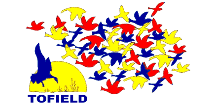 Tofield, Alberta, lies about 70 km southeast of Edmonton, near Beaverhill Lake, a major feeding and resting habitat for shore birds. Population is about 1700. The town and lake host the Beaverhill Lake Snow Goose Festival in April, and the birdlife is echoed in the design of the flag, with a sky full of flying birds, and a goose landing in a wetland scene before the setting sun.