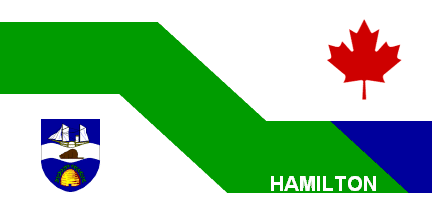 Commencing in the canton, a green horizontal bar proceeds lengthwise, then bends at an angle of approximately 45 degrees and proceeds diagonally to the lower fly, then again becomes horizontal and proceeds lengthwise in green with white block letters proclaiming "HAMILTON" occupying one-quarter of the green bar which changes to ultramarine blue to the end of the fly. The upper horizontal bar represents the Hamilton Mountain, the diagonal bar represents the escarpment, the lower horizontal green bar represents the lower City and the ultra marine blue portion of the bar represents the Harbour.