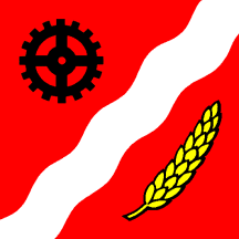 Gules a Bend sinister wavy Argent between a Cog Wheel Sable in chief and Ear of Wheat Or bendwise sinister in base.