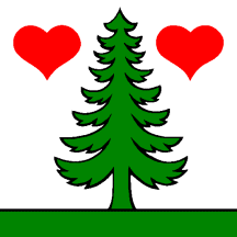 Argent a Pine Tree issuant from a Base Vert between in chief two Hearts Gules.