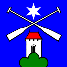 Azure a Tower embattled Argent roofed Gules issuant from Coupeaux Vert and in chief two Oars of the second in Saltire and between them in chief a Mullet of the same.