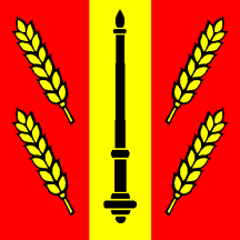 Gules between four Ears of Wheat Or two dexter bendwise and two sinister bendwise sinister on a Pale of the last a Bailiff's Mace Sable.