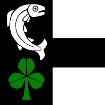 Impalled Sable in chief a Fish embowed Argent and in base a Trefoil Vert and of the second a Bar of the first.