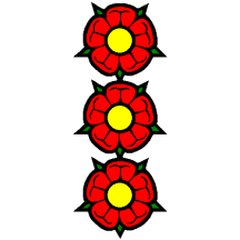 Argent three Roses Gules barbed and seeded proper in Pale.