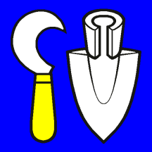 Azure a Sickle Argent bladed to sinister handled Or and a Ploughshare inverted of the second.
