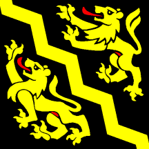 Sable a Bendlet dancety Or between two Lions passant of the same langued and viriled Gules.