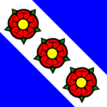 Azure on a Bend Argent three Roses Gules barbed and seeded proper.