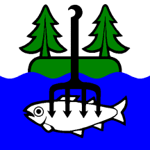 Per fess wavy Argent two Fir Trees issuant from an Mount Vert and Azure a Fish nainaint of the first and overall a Fishing Spear Sable in pale.