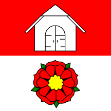 Per fess, Gules a Barn Argent and Argent a Rose Gules barbed and seeded proper.