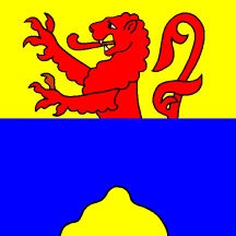Per fess, Or, a Semi Lion issuant Gules, and Azure a Mount issuant Or.