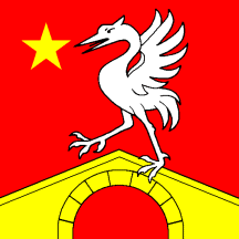 Gules, a Crane Argent rising from a chevron-like Bridge Or and in chief dexter a Mullet of Five of the last.