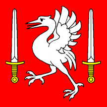 Gules between two Swords in fess both palewise Argent hilted Or a Crane rising of the second.