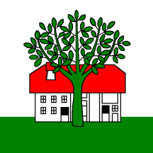 Argent a House of the same roofed Gules behind a Beech Vert all issuant from a Base of the last.
