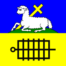 Per fess Azure on a Mount Vert a Lamb Argent sejant holding a Latin Cross Or and Or a Grill fesswise Sable.