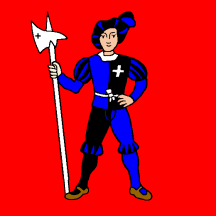 Gules, a Guard stantant afrontee clad Azure and Sable ensigned with a Cross on sinister, holding in dexter a Halberd Argent.