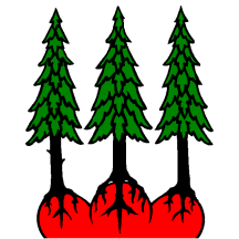 Argent, three Pine trees Vert trunked and radicated Sable issaunt from Coupeaux Gules.