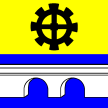 Per fess, Or a Mill Wheel Sable, and Azure a Two-arched Bridge Argent.