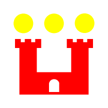 Argent, a Castle Gules, in Chief three Bezants.