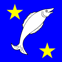 Azure, a Fish embowed Argent in bend sinister between two Mullets of Five Or.