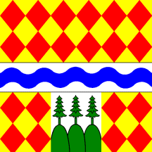 Lozengy Gules and Or, on a Bar Argent a Barrulet wavy Azure, in Base on a panel Argent issuant from three mounts Vert as many Pine trees of the same.