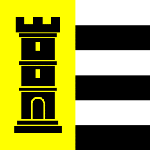 Per pale Or a Tower Sable and Barry of Six Argent and Sable.