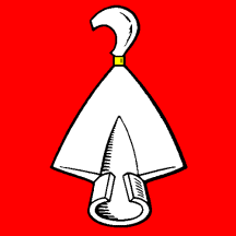 Gules a Plough Share Argent topped with and connected to a Sickle of the same ringed Or.