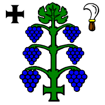 Argent, a Vine Vert fructed Azure issuant from a Cross pattee of the second and in chief dexter a Cross pattee Sable and sinister a Sickle proper.