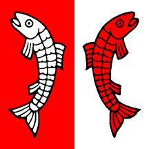 Per pale Gules and Argent two Fishes embowed addorsed counterchanged.