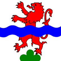 Argent, on a Coupeaux Vert a Lion rampant Gules, a Bar wavy overall.