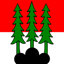 Per fess Gules and Argent, overall three Pine-trees Vert issuant from a Coupeaux Sable.
