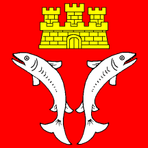 Gules, in chief a Castle with three Towers Or, in base two Sea-daces