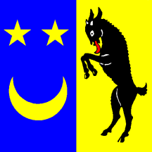 Per pale, 1. Azure, two mullets of five above a crescent upward Or; 2. Or, a kid rampant Sable, langued Gules, horned and lined Argent.