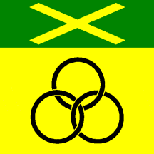 Or, three Annulets one and two interwoven Sable, in chief Vert a Saltire couped Or.