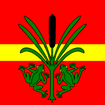 Gules a Barrulett Or, overall a Reed Vert fructed Sable between two Frogs Vert in base.