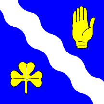 Azure, a Bend wavy Argent, in chief a Hand Or, in base a Trefoil of the same.