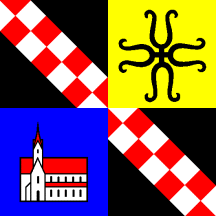 Quartered, first and fourth Sable a Bend counter-compony Argent and Gules, second Or a Cross fourchy Sable and third Azure a Church Argent roofed Gules.