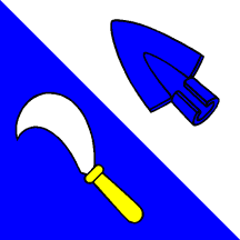 Per bend Argent a Ploughshare Azure in bend and of the second a Sickle in bend of the first handled Or.