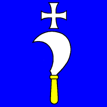 Azure a Sickle Argent handled Or and in chief a Cross pattee couped of the second.
