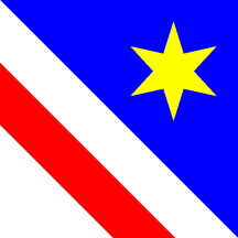 Per bend Azure a Mullet Or and Argent a Bend Gules.