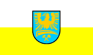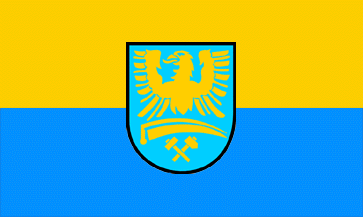 Possible administrative flag. Like Upper Silesia 1920-1935, but with coat of arms, consisting of a blue field with a yellow eagle above a scythe and crossed hammers, at the center.