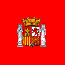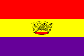 "The decree of 27 April 1931 (Legal Collection of the Army, number 201) in its second article defined the National Flag as being composed of three stripes, red, yellow and purple, bearing in the center of the second stripe a shield which, for want of better definition, was identified with the one that had appeared on the five peseta coins of 1869, that is: Castile, Leon, Aragon, Navarre without the emerald, and Granada in the point, supported by the pillars of Hercules without crowns and resting on land and with a single interlaced ribbon with the legend Plus Ultra, the crest a mural crown. This decree was elaborated by the Circular Order of 6 May following (Legal Collection of the Army, number 230), which in its second article specified that the flag to be flown on fortifications, camps and buildings would have dimensions of 135 in width by 225 in length."