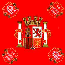 According to Calvo and Grávalos 1983, the President's Standard (illustration 575, Guión del Presidente de la República 1933-1939) is also red with centered coat-of-arms, but this is much larger, about half the hoist in height. In each corner there is a 45º tilted red cartouche bordered with a gold fillet, from behind which some green olive leaves appear. The top hoist and bottom fly ones bear a cypher with the letters "PR" (for Presidente de la República), the other two the date the Republic was proclaimed, "14" "ABRIL" "1931" in three lines. Gold fringes, grey coloured finial with olive leaves bordering an anagram with the letters "RE" (for República Española), and a streamer with the colours of the Republican flag. I believe there is a small mistake in Calvo and Grávalos 1983 since it shows the arms of Navarre with the green emerald in the center, which was expressly omitted in the 1931 Decree describing the Republic's coat-of-arms.