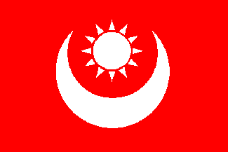 The new country's flag is red, with a gold sun and crescent moon device in the center. The sun is similar to the sun on the Taiwan flag; the points of the moon point upwards. The sun-moon device also appears on some cars and buildings and police uniforms, sometimes in gold, sometimes in green.
