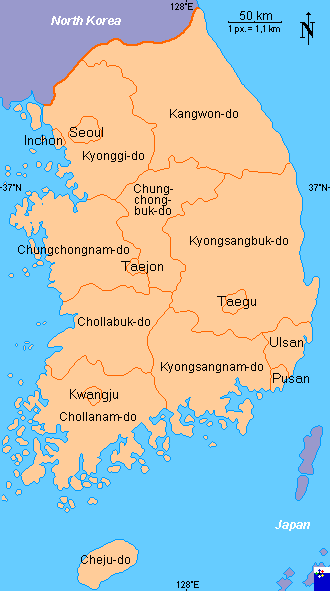 Provinces: Cheju-do Chollanam-do Chollabuk-do Ch’ungch’ongnam-do Ch’ungch’ongbuk-do Kang-won-do Kyonggi-do Kyongsangnam-do Kyongsangbuk-do Autonomous cities: Inchon Kwangju Pusan Seoul Taegu Taejon Ulsan |