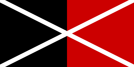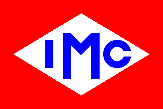 Red flag with a white lozenge charged with IMC in blue, the letter M being bigger than the two others.